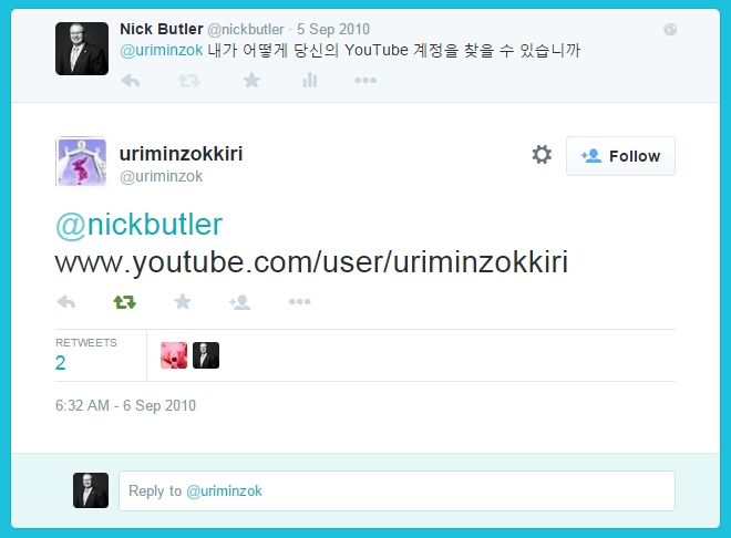 Back in 2010, North Korea launched an official Twitter account, @uriminzok. This was the first presence the secretive nation had on social media, and I thought, “Wouldn’t it be fun to get North Korea to tweet at me?” So, using Google translate I simply asked: “What is your YouTube account?”